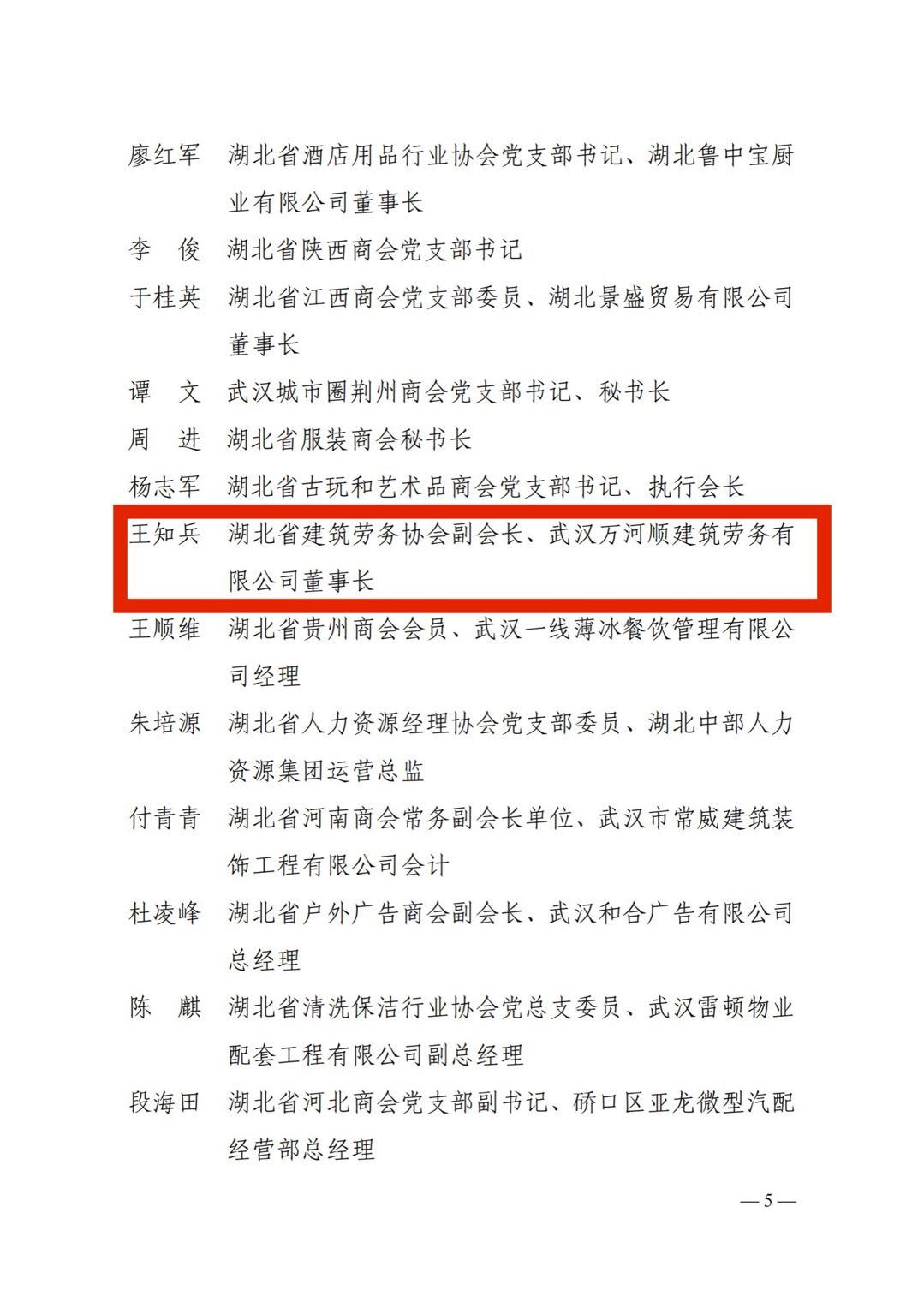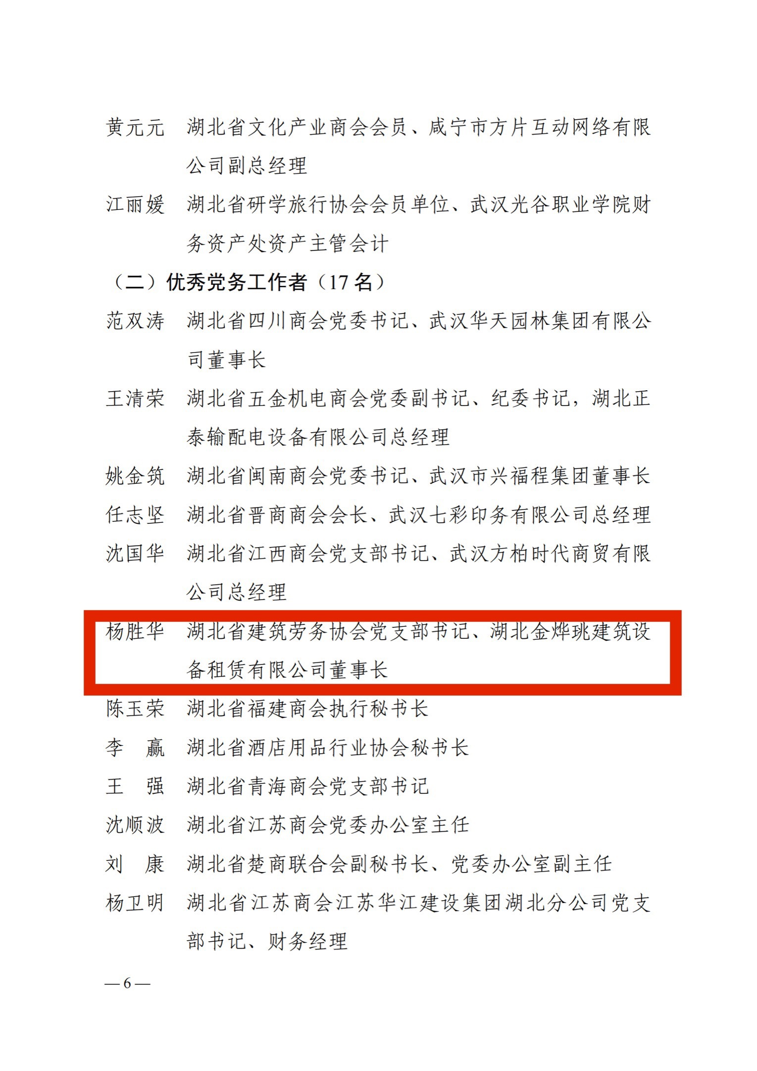 大会通报表扬了23名优秀共产党员,17名优秀党务工作者,15个先进基层党组织和18名支持商会党建工作的优秀民营企业家。其中,湖北省建筑劳务协会党支部被评选为“先进基层党组织”,湖北省建筑劳务协会党支部书记、湖北金烨珧建筑设备租赁有限公司董事长 杨胜华被评选为“优秀党务工作者”,湖北省建筑劳务协会支部委员(副会长)、武汉万河顺建筑劳务有限公司董事长 王知兵被评为“优秀共产党员”,湖北省建筑劳务协会副会长、武汉俱进建筑劳务有限公司董事长 张小立被评选为“支持商会党建工作的优秀民营企业家”,在大会中通报表扬,并颁发了荣誉证书(文末附全部名单)。