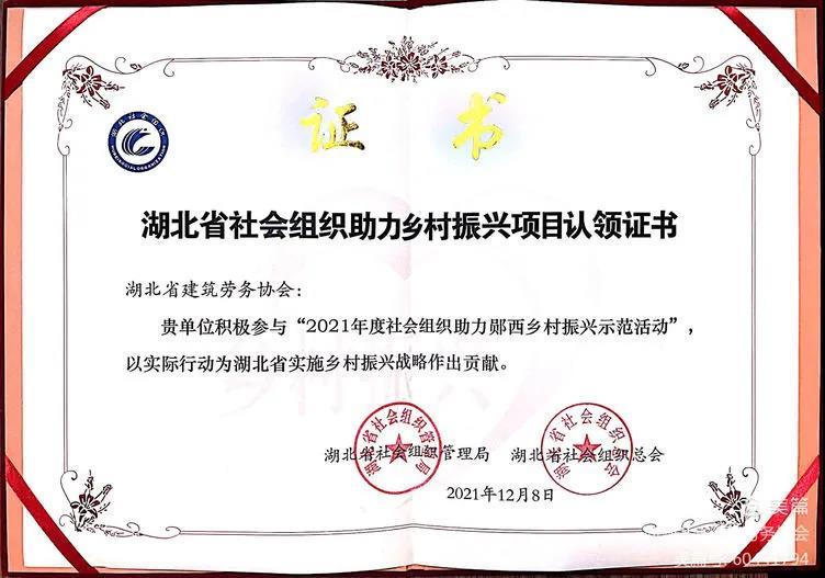 为进一步推进脱贫地区发展和群众生活改善,今年7月20日,省民政厅向全省社会组织发出“倡议书”,倡议社会组织发挥自身优势,助力乡村振兴。湖北省建筑劳务协会积极响应,踊跃参与认领扶贫项目,12月8日在湖北省社会组织助力乡村振兴示范对接仪式上签约帮扶六郎乡康家梁村及羊尾镇板桥村,并分别捐款3万元。湖北省建筑劳务协会自成立以来,积极参与各类社会公益,充分彰显建筑劳务企业家精神,勇挑社会担当,屡受上级主管部门表彰。