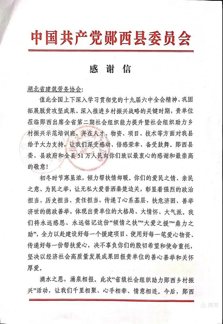 12月6日至8日,在全省社会组织助力乡村振兴示范培训班上,56家社会组织与郧西县各部门、医院、学校等单位签约,扶持当地产业发展,关爱农村老人、儿童,助力郧西乡村振兴。湖北省建筑劳务协会党支部书记杨胜华、副会长黄治银代表协会参加本次活动,对接郧西县留守儿童之家提档升级项目,捐款6万元善款助力郧西乡村振兴。