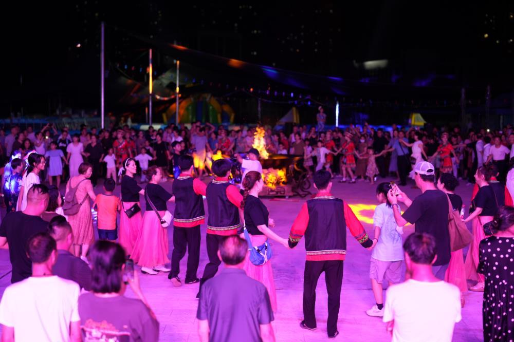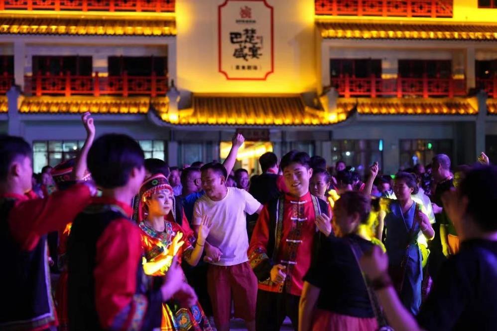 当夜幕降临,三峡·民俗演艺城迎来了更加热闹的时刻。手工特产、非遗工坊、主题餐厅、文化驿站、文创工坊、月老剧场、观星楼、巴人风情街等建筑群灯光璀璨,照亮了夜空。全新的夜游体验让现场热情高涨,游客们流连忘返。在惊艳的国潮演艺结束之后,篝火女儿会燃情启动,游客们牵手围圈,纵情歌舞,热闹非凡,演艺“夜经济”释放出全新的活力。
