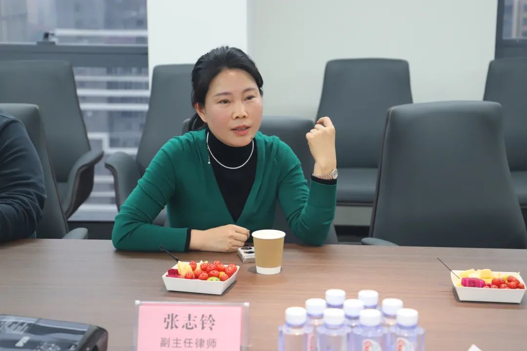 我会会员、律所合伙人、副主任律师张志铃对我会领导及常务理事成员的到来表示热烈欢迎,在张志铃主任一行带领下,全体成员一同参观了律所办公环境,深入了解了律所的专业实力和服务品质。随后,于会议室开展座谈交流会。