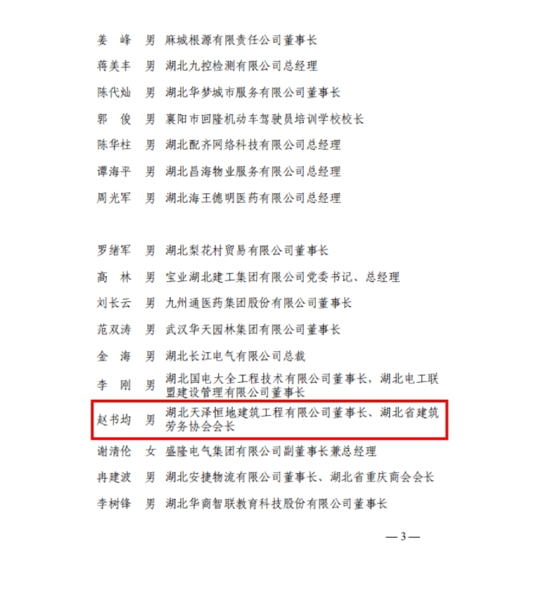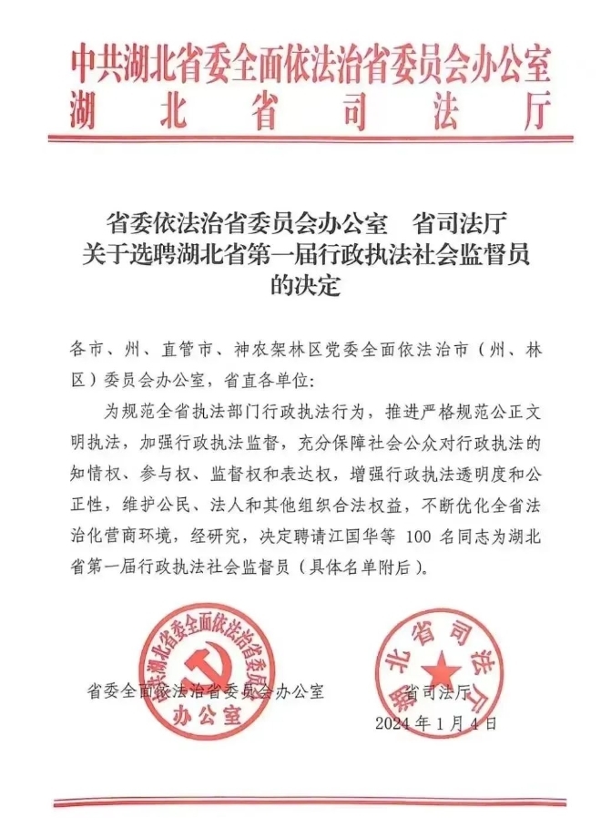 近日,湖北省委全面依法治省委员会办公室、省司法厅发布关于选聘湖北省第一届行政执法社会监督员的决定,湖北省建筑劳务协会会长、湖北天泽恒地建筑工程有限公司、湖北匠心建设集团有限公司董事长赵书均获聘。