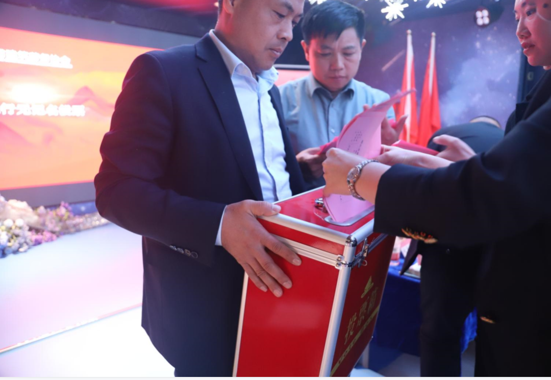 发放选表,会员单位代表填写完毕后,依次上台将表决票及选票投入票箱。