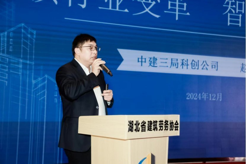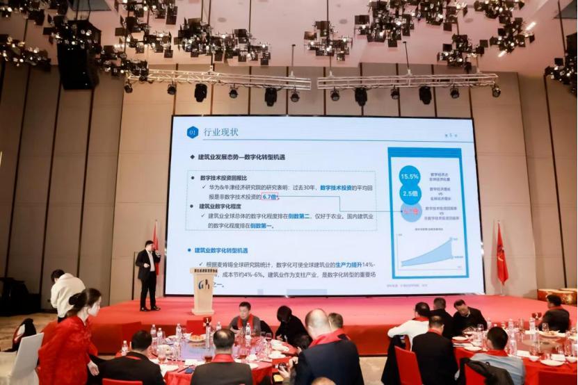 会议第七项,特邀中建三局科创公司智能建造事业部执行总经理、汉芯公馆项目总经理赵德军作《引领行业变革 智造行业未来》主题分享。赵德军总表示:目前建筑行业面临多重问题,将迎来了行业数字化转型的重要机遇。赵德军总经理以汉芯公馆项目为例,从数字设计、智能生产、智能施工三个方面,对实现建造智能化目标及绿色发展发表了精彩的分享。